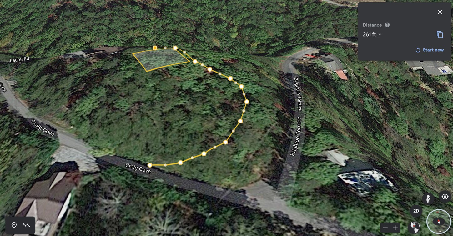 I’ve been playing with Google Earth to plot out the best location for our driveway. There are several things to consider. The shorter the better in case we decide to pave it. I’m really hoping it won’t be too steep for the average passenger car to navigate. We may have to pave it in the steeper sections and the parking lot and leave the beginning as gravel. It looks like it costs about $10/sq ft for asphalt. The driveway plotted above is 261 feet long. At 10 feet wide this comes to 2611 sq feet or $26,110.00. It would be great to pave everything but we’ll have to see how the budget falls into place. The driveway is one factor that is variable as we have several options.